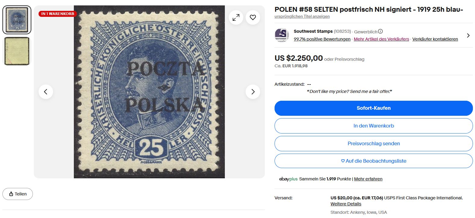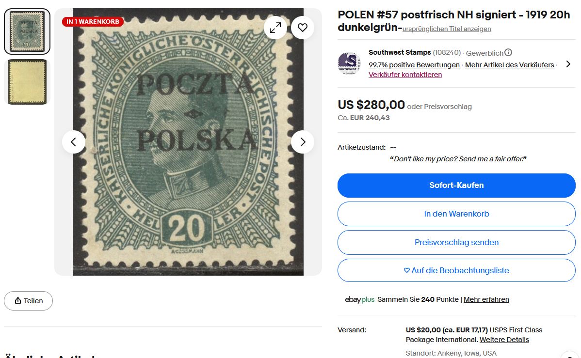 Der Händler Southwest Stamps aus Ankeny, Iowa, USA – mit über 108.000 Bewertungen – bittet eine 25 H Marke für $2.250 an. Die Marke ist angeblich J.Ryblewski geprüft. Handschriftlich ist die Position F-II-ga-17 notiert – was das auch immer heißen soll. Ryblewski hat aber nie Notizen auf den Marken gemacht. Wenn man sich die Marke anschaut, dann erkennt man ein dünnes Z. Das würde bedeuten, dass die Marke mit der Platte I überdruckt wurde. Nun gibt es aber nur 25 Marken des 25 H Wertes, die mit Platte I überdruckt wurden. Davon auch nur 10 Marken mit dünnem Z. Nun ist das Problem, dass keine dieser 10 Marken einen Aufdruck wie der gezeigt hat. Insbesondere das Z mit dem gebogenen Mittelstrich sieht stark nach der gefälschten Platte 1F aus. Wenn man bedenkt, dass die 25H Marken der Platte I für mehr als 20.000 € gehandelt werden, macht man sich schon Gedanken.